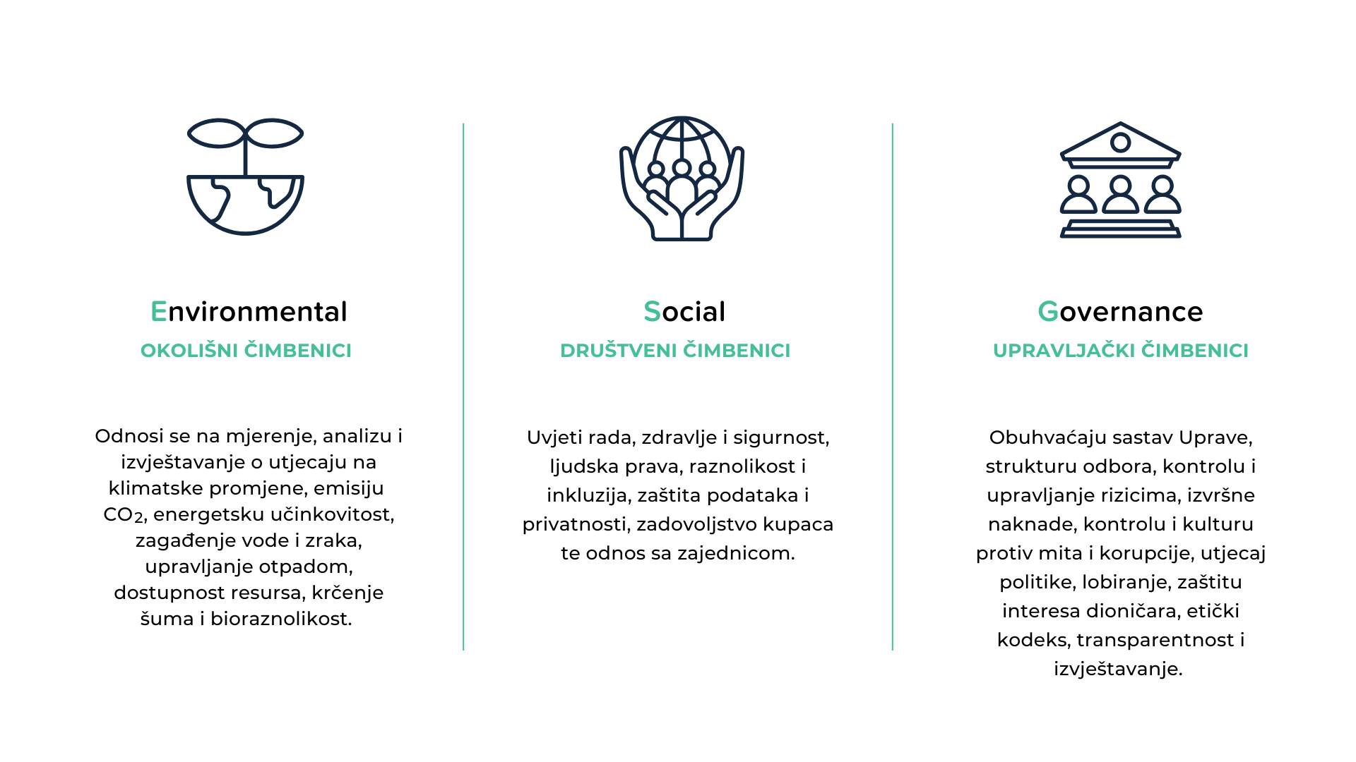 Ove kriterije koristimo za mjerenje kako tvrtka upravlja svojim utjecajem na okoliš, kako se odnosi prema ljudima i ljudskim pravima te kako upravlja sobom i svojim lancem vrijednosti. Za osiguranje dugoročne održivosti, otpornosti i konkurentnosti na tržištu, potrebno je voditi se ESG principima u razvoju poslovanja tvrtke, mjeriti ih, analizirati te izvještavati svoje dionike.