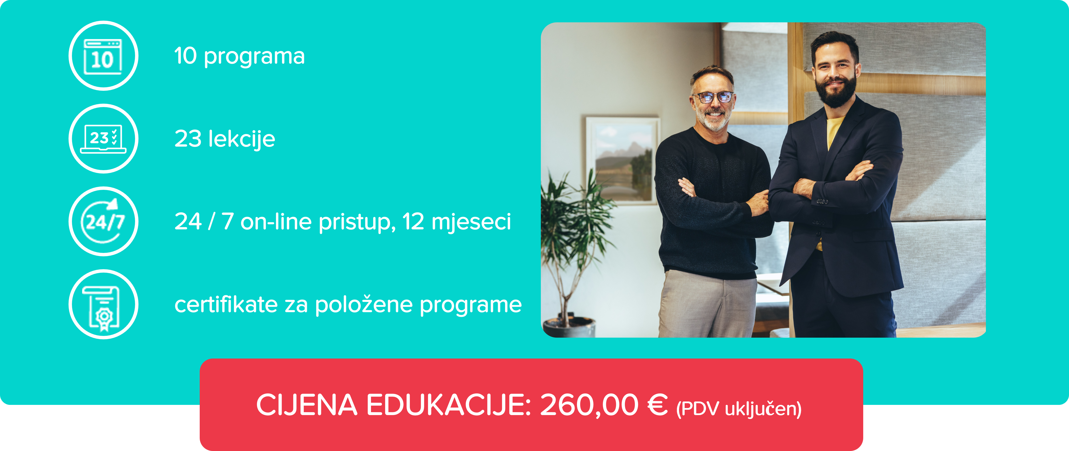 Naši edukacije bazirane na višegodišnjem iskustvu i najboljim primjerima iz prakse. Provjerene, zanimljive, praktične i uvijek dostupne lekcije pomoći će vama, ali i vašem poslovanju, da se razvijate i napredujete!